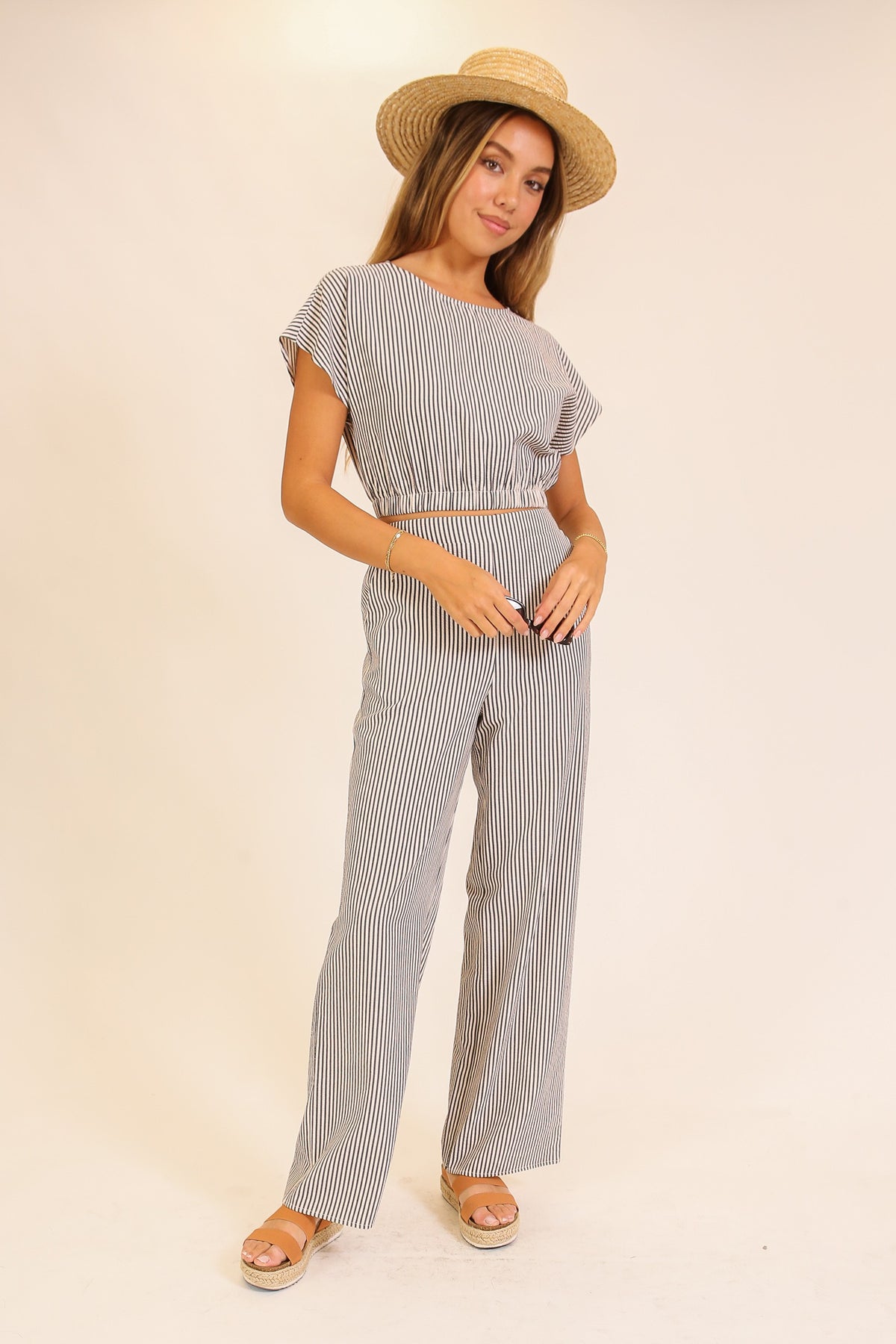 A stylish and easygoing striped pant set made for everyday comfort. The relaxed-fit top features soft draping and an elastic waist for a flattering shape, while the matching wide-leg pants create a clean, elongated silhouette. Crafted from lightweight, breathable fabric, this set is perfect for warm days, casual outings, or relaxed weekend wear. Wear the pieces together for a coordinated look or mix and match for effortless versatility.