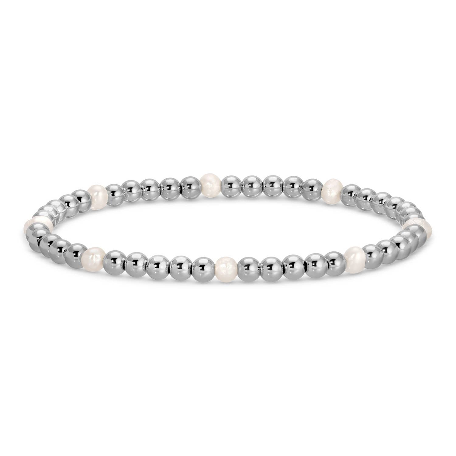Elevate your style with this elegant silver bead bracelet featuring lustrous freshwater pearl accents. Crafted on a rhodium-plated brass base, this stretch bracelet offers both durability and a comfortable fit. Its timeless design effortlessly complements any outfit, making it a versatile addition to your jewelry collection. Perfect for adding a touch of sophistication to everyday wear or special occasions.